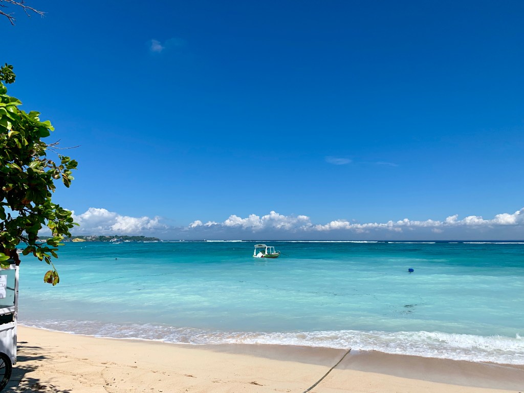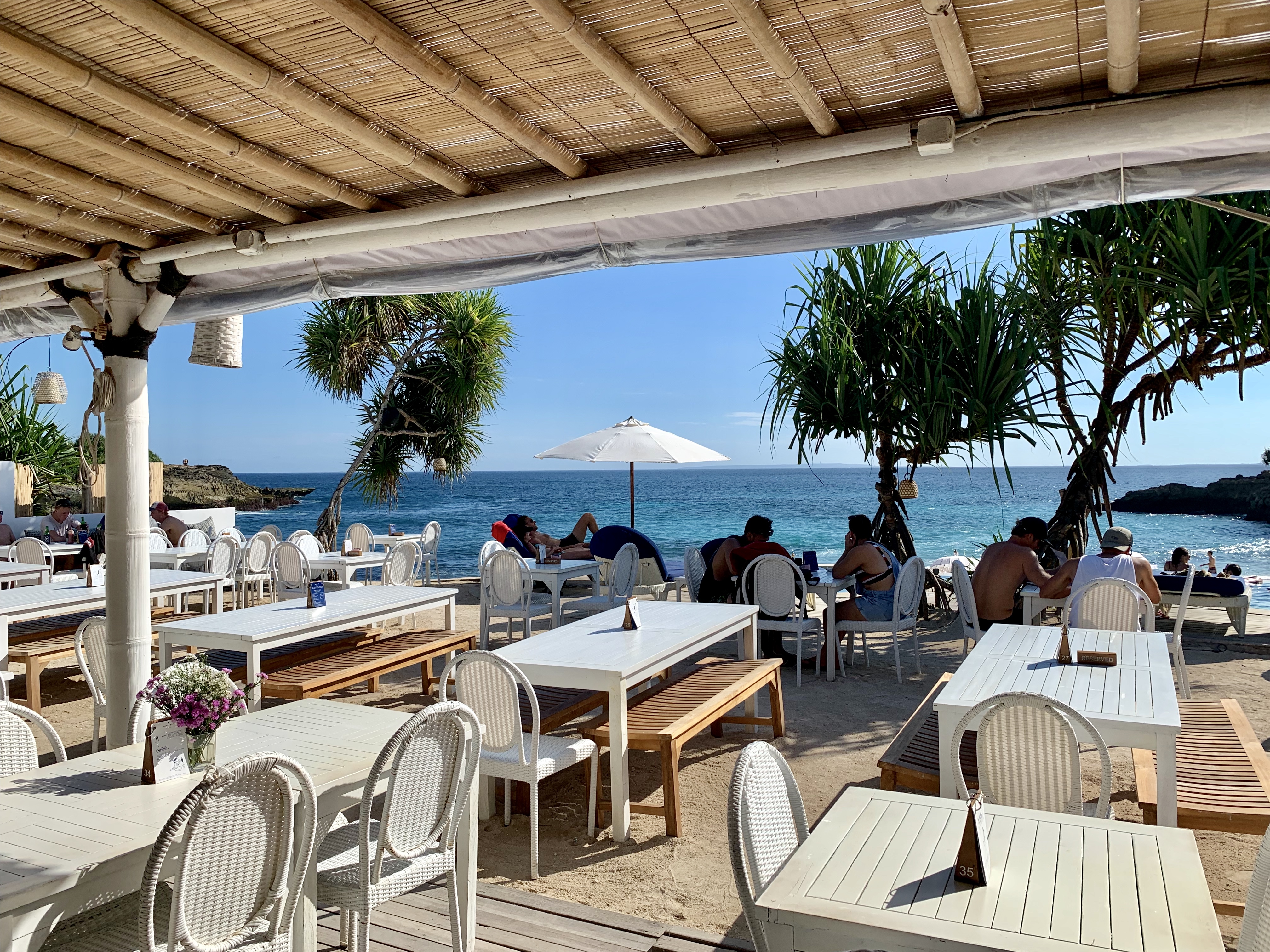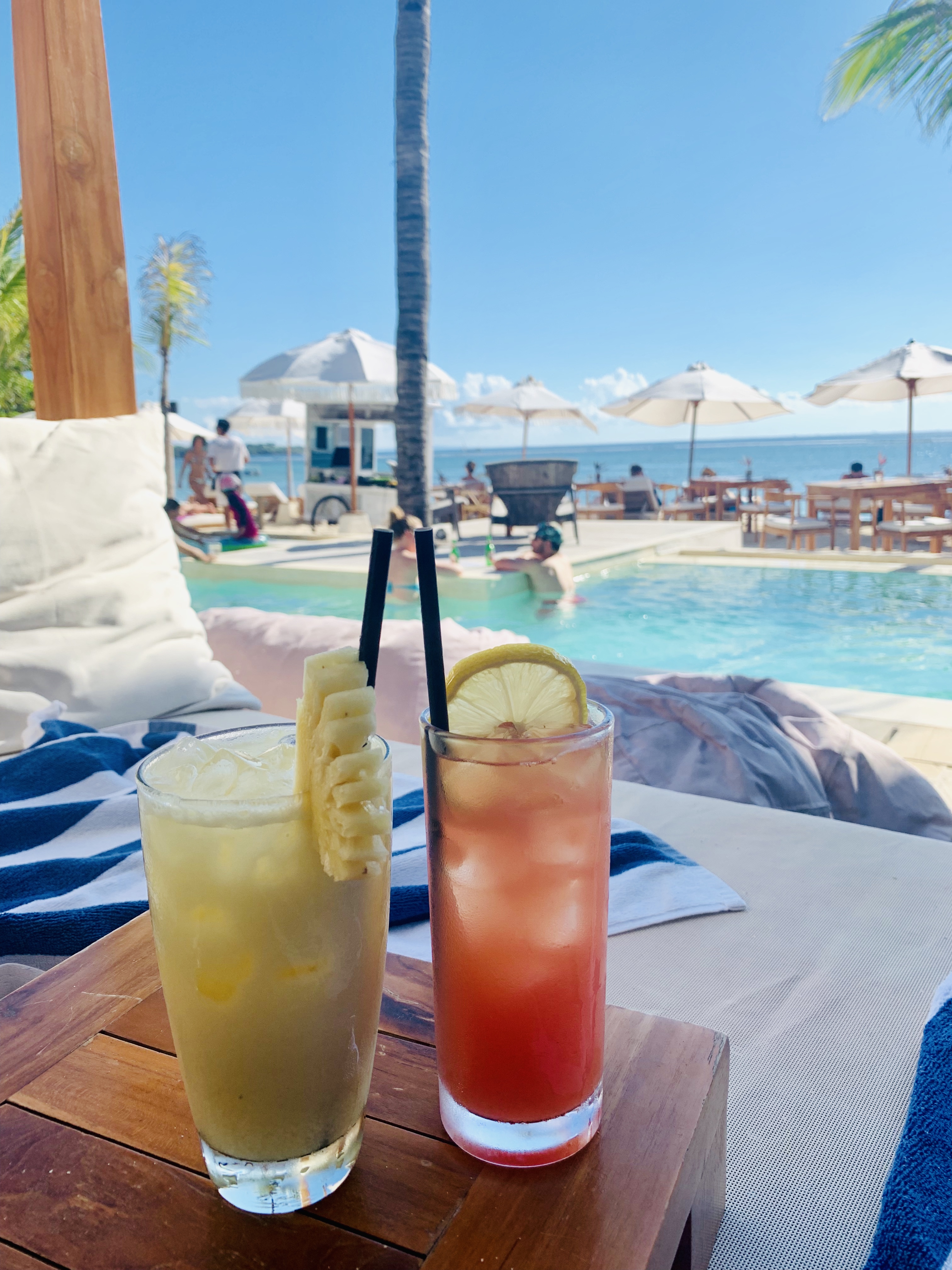 This is a super small, simple hotel but a beautiful location, its infinity pool looks out over the ocean with a fantastic view of the volcanos of Bali. It was an overcast day so we headed into town to explore, and a short 10min walk down the hill brought us to Mushroom Beach, a nice little spot with lots of cute places to eat but not great for swimming as there are a lot of boats. We decided to plough on to the next beach Jungutbatu, although we weren’t sure exactly how far it was. The vast majority of people use scooters to get around but it just seemed far too dangerous to me so we decided to walk, this was a mistake. We arrived at the The Deck 45 mins later and very sweaty, only to learn the most of the bars and restaurants will pick you up and drop you off FOC, everydays a school day. This was a great little bar looking up the beach and we settled in for a bottle of fizz and some dinner, perfect. We then walked to the far end of the beach to Ohanas which is a beach club and restaurant and really nicely done so we settled on a couple of beanbags and watched the beach bonfire crackle just as sun was setting, thankfully they gave us a lift home.