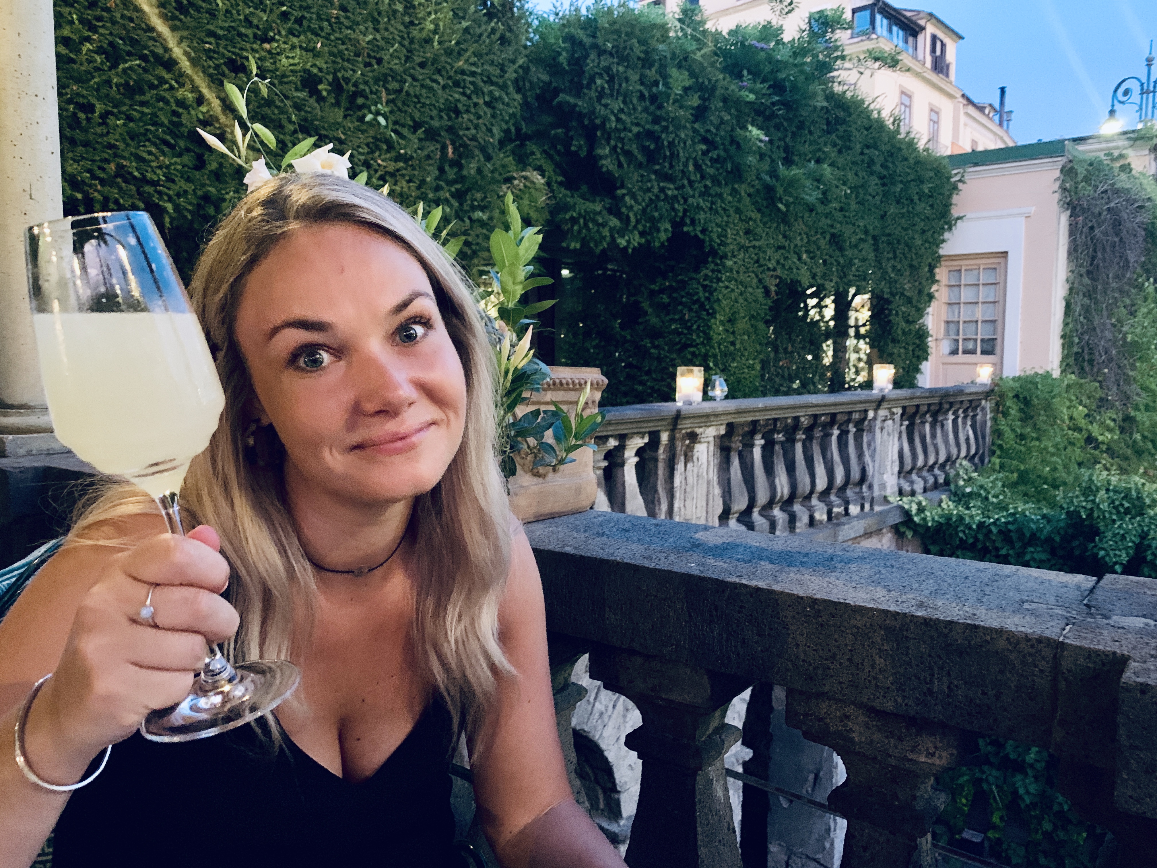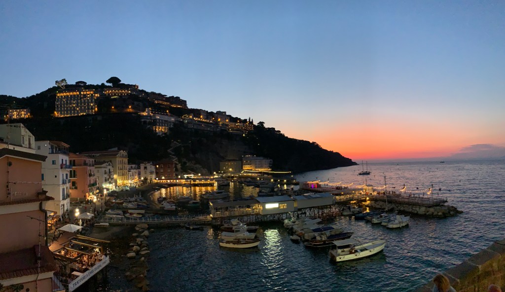 After a relaxing afternoon we walked down into Sorrento which is about 25min, hitting the main square we were keen to find a bar and watch the world go by. We settled on La Pergola which is a fairly swanky joint carved into the dark rock with purple wisteria cascading down the walls and soft jazz playing in the background. The waiter promptly brought over the free snacks which seem to come with all drinks in Italy and suggested we go for the daily special, lemon spritz, which sounded good to us. I can’t quite bring myself to say how much we paid for these but safe to say they were pretty much the most expensive drinks we’ve ever had and we learnt a valuable lesson to always check the menu first, but we had a lovely time so it wasn’t so bad.
