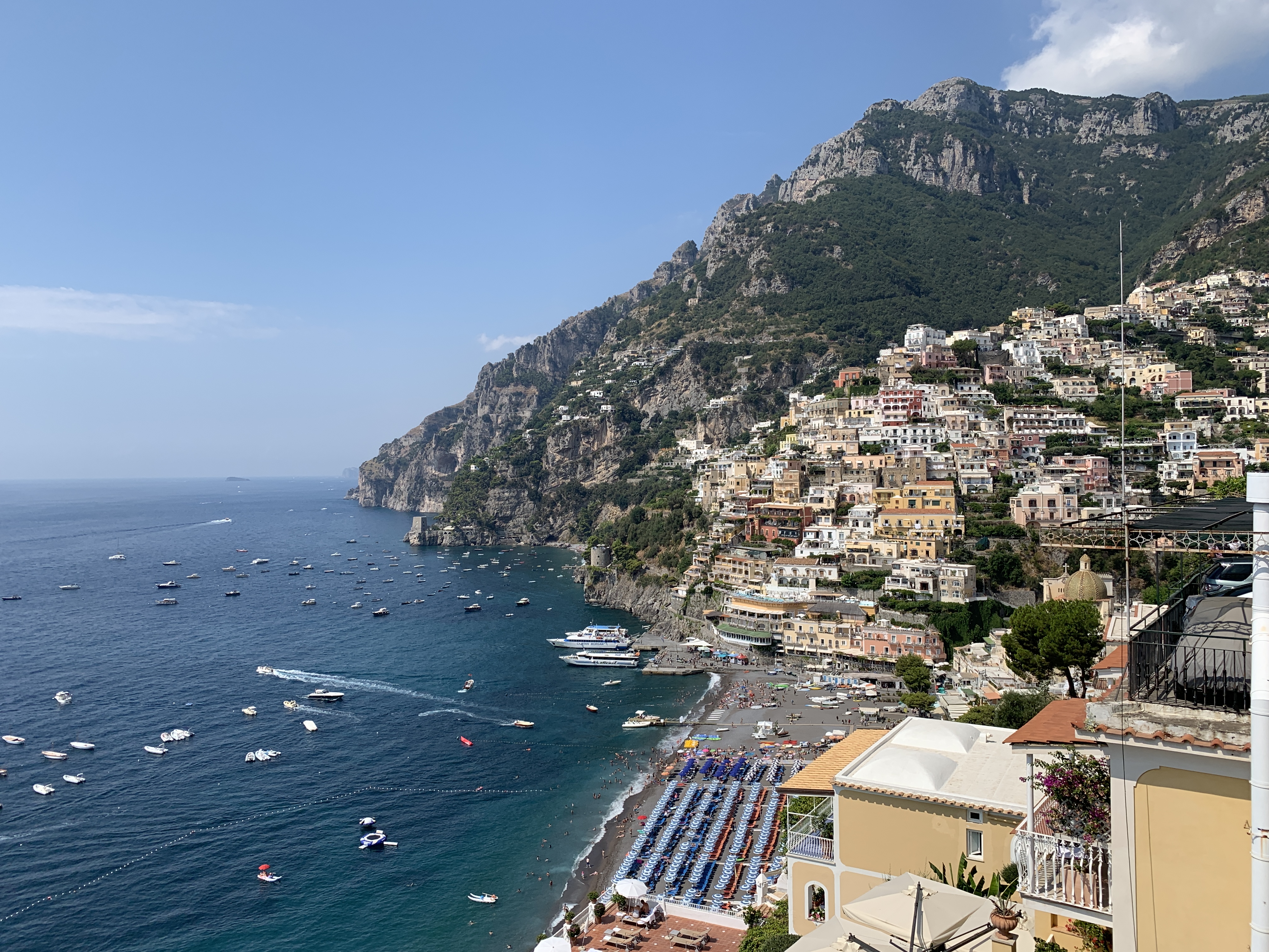 The next day after a hearty breakfast with mimosas on tap, looking out to sea wondering who was on the fancy yachts, we set out for Positano. Now you can get the local bus but reports weren’t great so we went for the tourist bus which although slightly more expensive at €15 each return you were guaranteed and seat and there was aircon, so well worth it as far as we were concerned. Less than an hour later we were snaking our way into the town and enjoying our first views of the picture postcard houses built into the cliff.